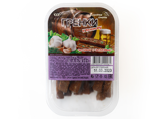 Сурские гренки Чеснок с зеленью (100 гр) – вкусная закуска к пиву, которую в нашей компании вы сможете купить по привлекательной цене. Каждая партия проходит строгий контроль качества – сначала проверку осуществляет производитель, а затем мы. Поэтому вы получаете только свежий и отборный продукт.
